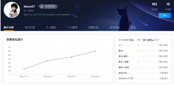 王盛祺(社区昵称:Macw07) 梦想的萌芽:从游戏到编程的华丽转身 王盛祺,一位对编程充满激情的青年,曾在宁波国际学校打下坚实的学习基础,目前在国外公立高中继续深造。在家人眼中,他是一个极具独立精神和创新思维的学生。 自幼对计算机技术情有独钟的王盛祺,曾深深沉醉于Minecraft等游戏。然而,与大多数孩子不同的是,王盛祺没有止步于游戏本身,而是被其背后的逻辑与创造所吸引,这股好奇心逐渐转化为对编程的热爱。他逐渐意识到: “那些看似简单的游戏背后,隐藏着复杂而美妙的编程语言,一种能够创造无限可能的魔法。” 他的编程之路既源于个人爱好,也深受父亲的影响。尽管在他父母那一代,由于物质和学习资源的限制,接触计算机的机会并不多,但他们深谙计算机知识对于未来的重要性。这种认识激励着他。 于是,他决定将这份期望,转化为对编程世界的探索。在父亲的支持与鼓励下,王盛祺踏上了编程的征途,这段旅程,注定不凡。 小码王:编程启蒙的智慧摇篮 2018年,命运的齿轮悄然转动,王盛祺与小码王相遇,宁波广博校区成为他编程旅程的起点。在这里,他邂逅了人生中最重要的两位编程导师——刘鹏威和樊璐,引领他步入编程殿堂。 王盛祺在小码王的编程学习轨迹 在小码王,王盛祺从飞码2.0到Python3.0,再到C++V3.0,每一次跨越,都见证了他的成长与蜕变。特别是2023年的杭州集训营,十天的沉浸式学习,让他的编程学习达到了前所未有的高度,也为他的编程之路铺设了坚实的基石。 突破与超越:编程艺术的追求 编程之路,从来都不是一马平川。王盛祺在前进的道路上,也曾遭遇瓶颈,面对相似的挑战感到厌倦,遇到难题时心生畏惧。但他没有选择退缩,而是将每一次挫折视为成长的契机,通过不懈地学习新算法,增加实践的深度与广度,最终实现了自我超越。他深谙,编程之美在于不断探索与创新,只有持之以恒,方能在编程的艺术中达到炉火纯青的境界。 荣耀与成就:编程之路的突破 在国际编程赛事舞台问鼎 他在 USACO(美国信息学奥林匹克竞赛)金组别中取得了优异的成绩,同时在 OUCC (牛津大学编程挑战赛)Elite 组和 ACSL(美国计算机科学联赛)Senior组中分别获得了国际荣誉奖和个人更高奖以及团队金奖。更值得一提的是,在 ACGO 社区总榜上,除了教师之外,王盛祺的排名高居榜首。这些荣誉不仅彰显了他在编程领域的非凡才能,也证明了他对于计算机科学的深刻理解和应用能力。 ACGO社区的灵魂灯塔 王盛祺的辉煌成就,不仅体现在国际编程竞赛的舞台上,更闪耀在ACGO社区的每一个角落。他的名字,如同一颗明星,照亮了无数编程学子的前行之路。在ACGO社区,他不仅是一位的学习者,更是一位无私的贡献者。他的文章与题解,饱含真知灼见,每一次分享都凝聚着对编程的深刻理解与独到见解。 目前ACGO社区是他的课余时间主要使用的学习网站,因为国外的学业相对轻松,他有了很多空闲时间,他说:“除了刷题,无聊时会写文章分享,浏览帖子,尽自己的力量帮助同学,自然而然就活跃在 ACGO了。”他的热情分享和高质量的题解,使他在社区论坛中赢得了极高的人气与影响力。 他积极参与官方赛事的出题与验题工作,将生活中的点滴融入编程的思考。尽管他对自己出的题目感到满意,但他始终认为还有提升的空间。王盛祺认为,出题不仅能够帮助自己加深对算法的理解,还可以通过赛后撰写题解来进一步巩固和提升自己的知识。 编程之路的另一种突围 王盛祺不仅在编程竞赛中取得了优异成绩,还利用课余时间编写了一本编程入门书籍。这本作品耗时三个月,完成后,他将其印刷并赠送给了周围的朋友们。他希望这本书能帮助对编程感兴趣的新手们快速上手,避免走弯路。 结语:编程少年的星辰大海 王盛祺的故事是一段勇于探索的旅程。他的经历让我们看到了一个年轻的编程爱好者如何通过自己的努力和热情,为社区的发展贡献力量。他并没有因为自己的成就而自满,而是始终保持谦逊和对学习的热爱。正如他的个性签名所说:“When you can’t find the sunshine, be the sunshine.” 他在ACGO社区中起到了积极的作用,不仅激励和帮助了许多编程爱好者,还带动了社区的良性互动和进步。 在 小码王ACGO 社区,我们致力于为每一个有梦想的学员提供优质的学习资源和交流平台,王盛祺的故事正是我们教育价值的更佳体现。让我们一起在编程的道路上,勇敢前行,创造更多的可能!