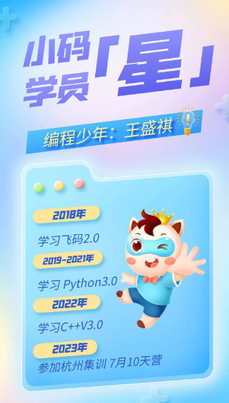 在小码王ACGO社区,有一位特别活跃的学员,他不仅是课程中的学员,更是社区中的热心出题者和激励其他成员的重要力量。他像是一颗璀璨的星辰,闪烁着智慧与创新的光芒。他就是小码王的明星学员——王盛祺。