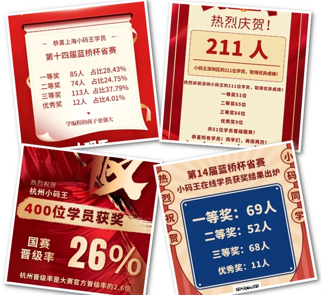 在蓝桥杯Steam考试和等级考试中,小码王凭借着自身的教学成果和卓越组织能力脱颖而出。通过授课、答疑、模拟竞赛等形式,小码王教学团队帮助学生快速熟悉各项赛事规则、透彻领悟竞赛核心理念、牢牢掌握相关知识谱系和能力要求,帮助学生学会利用编程思维和创新思维,往学习、认知、实践、探索、创新的方向发展。在2023年第十四届蓝桥杯国赛中,小码王在杭州、北京、上海、广州等地和线上直播课成绩遍地开花,国赛学员获奖,省赛晋级率高达26%,杭州晋级率更是大赛官方晋级率的2.6倍。